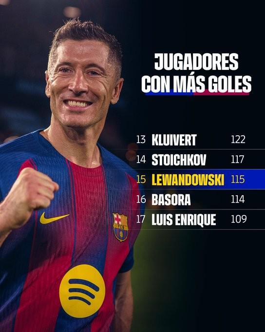 本场比赛,莱万在伤停补时阶段打进一球,根据统计,这是他代表巴萨打进的第115个进球,这也使得他超越巴索拉,独占队史射手榜第15名。